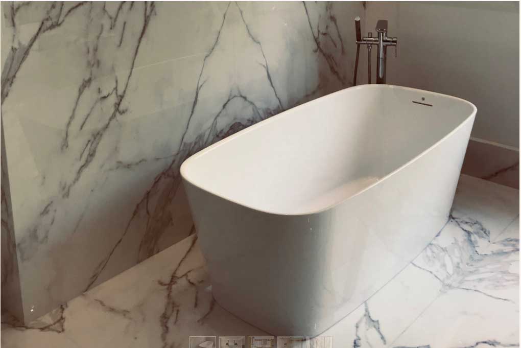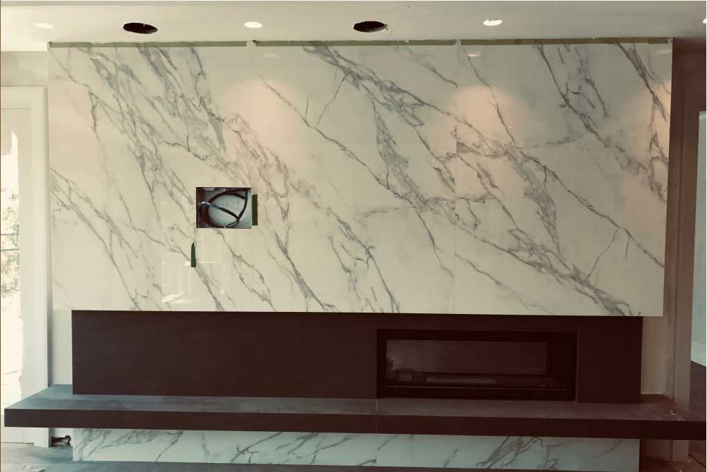Porcelain slabs are ideal for full height fireplace wall, shower walls, and kitchen backsplash.